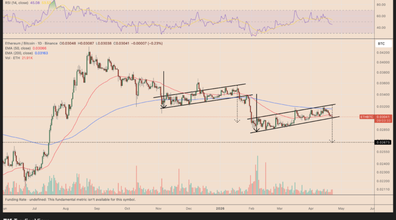 The ETH/BTC ratio has been carving out a bear flag pattern since February, consolidating inside a rising parallel channel after a sharp downside move.