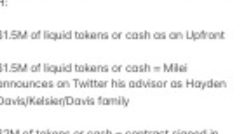 The document then details the payment structure. “$1.5M of liquid tokens or cash as an advance. $1.5M in liquid tokens or cash = Milei announces on Twitter that his advisor is Hayden Davis/Kelsier/the Davis family. $2M in tokens or cash = contract signed in person with Milei for blockchain/AI consulting for the Argentine government and/or Javier Milei and review with Javier and Karina,” the text reads.