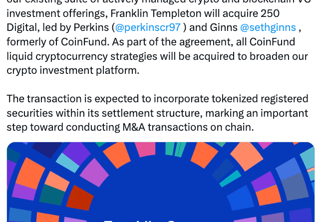 Franklin said the undisclosed transaction includes the 250 Digital investment team and all liquid cryptocurrency strategies previously run by CoinFund, and that it will also invest in those strategies as part of the agreement.