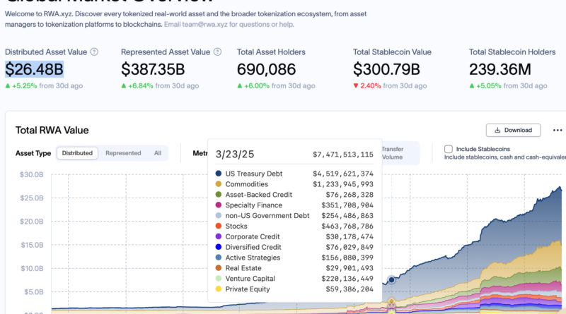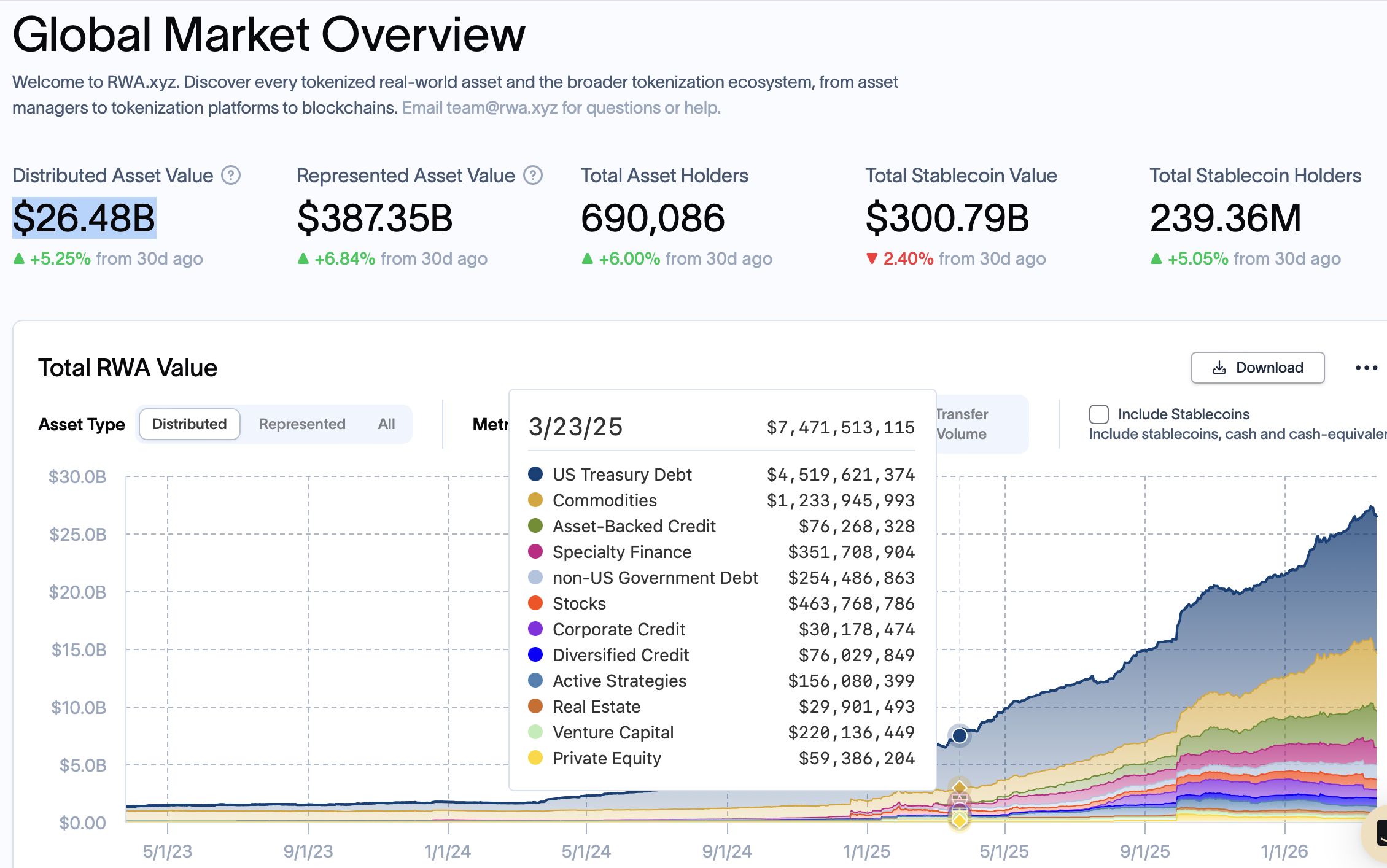 Data from RWA.xyz shows the total value of tokenized real-world assets (RWA) has grown sharply to around $26.5 billion, up from around $7.5 billion the same time last year. Among the RWAs onchain, around $908.5 million are tokenized stocks.