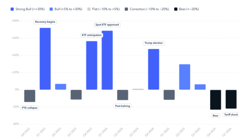 Bitcoin’s quarterly returns between Q4 2022 and Q1 2026. Source: TRM Labs