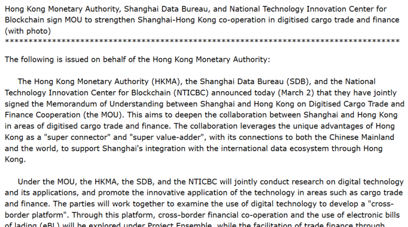The Hong Kong Monetary Authority (HKMA), the Shanghai Data Bureau (SDB) and the National Technology Innovation Center for Blockchain (NTICBC) have signed a memorandum of understanding (MoU) to deepen collaboration in digitizing cargo trade and finance.