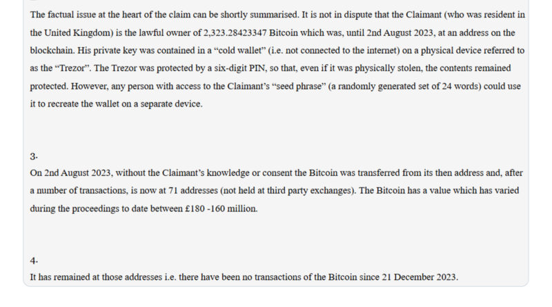 The UK High Court is currently reviewing a case involving the alleged theft of 2,323 Bitcoin (BTC), worth about $176 million. The theft did not stem from hacking or malware. Instead, it began with a seed phrase being exposed, which became the single point of failure in self-custody.