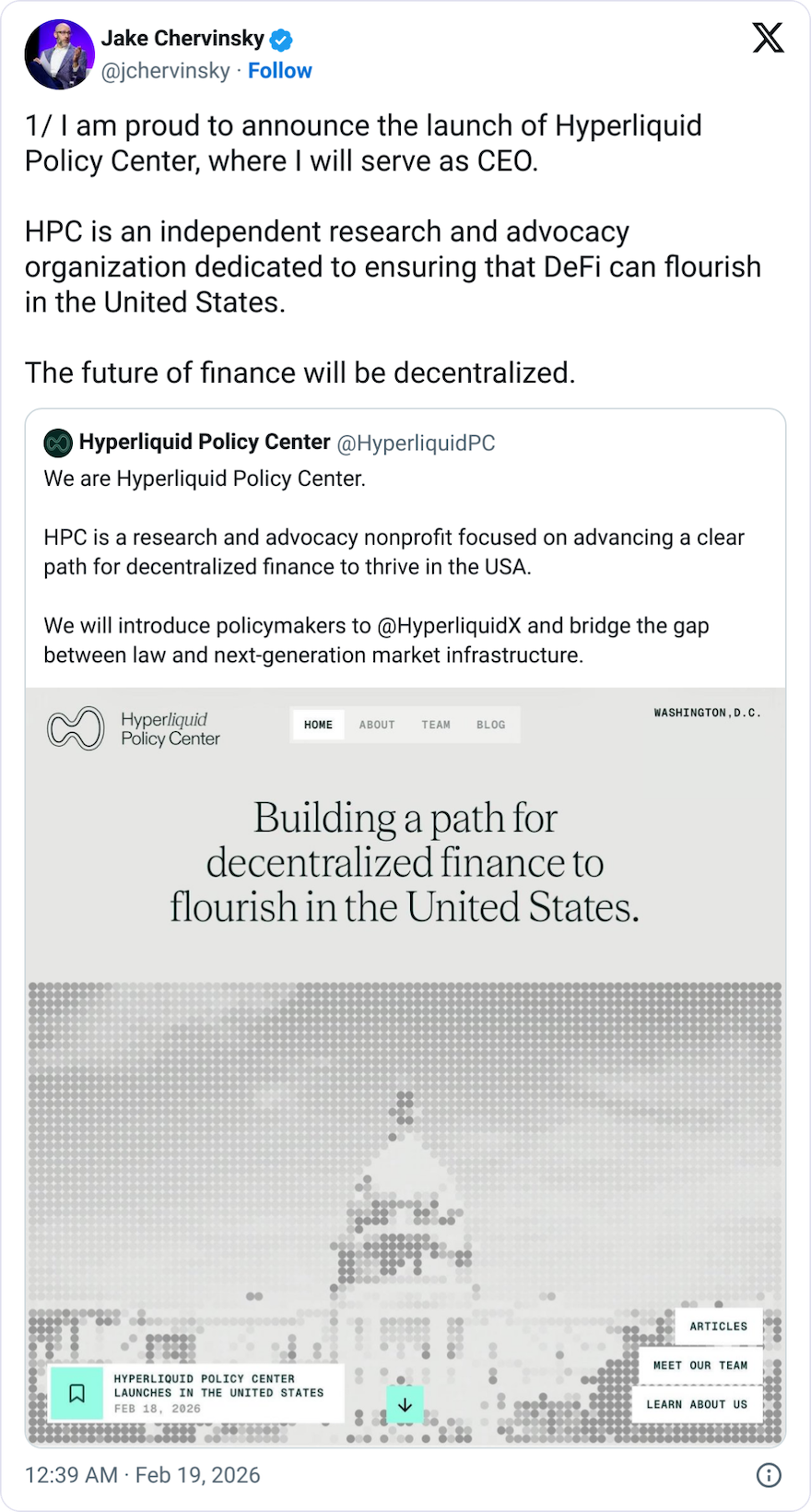 The Hyperliquid Policy Center said on Wednesday that it had launched in Washington, DC, and named Jake Chervinsky as founder and CEO, a veteran crypto lawyer who was the legal head at crypto venture fund Variant and former policy chief at crypto lobbyist Blockchain Association.