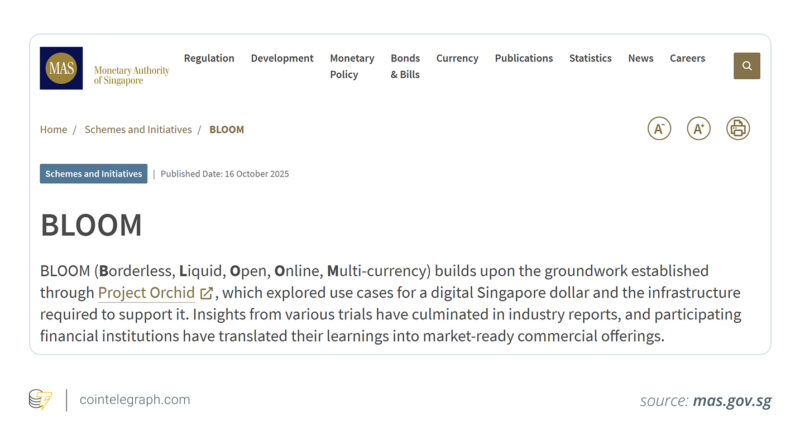 The MAS launched BLOOM in October 2025 to examine how tokenized money could improve settlement processes across borders and between institutions.
