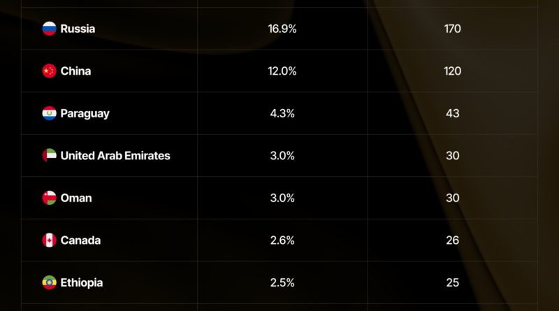 The US holds the largest share of global hashrate at over 37%, followed by Russia at around 17% and China at 12%, according to the Hashrate Index heatmap.