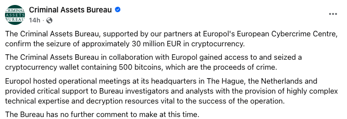 Ireland’s Criminal Assets Bureau (CAB) said in a statement on Tuesday that it had “gained access to and seized a cryptocurrency wallet” containing 500 Bitcoin (BTC), worth more than $35 million, with the help of Europol’s European Cybercrime Centre.