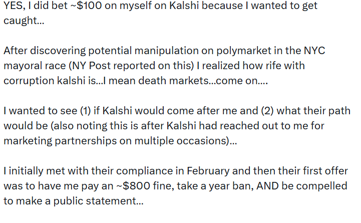 “YES, I did bet ~$100 on myself on Kalshi because I wanted to get caught,” he said, adding that he “wanted to see (1) if Kalshi would come after me and (2) what their path would be.”