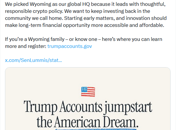 Kraken’s co-CEO Dave Ripley said the firm chose to support Trump Accounts in Wyoming due to the positive regulatory climate in the state, home to the firm’s headquarters.