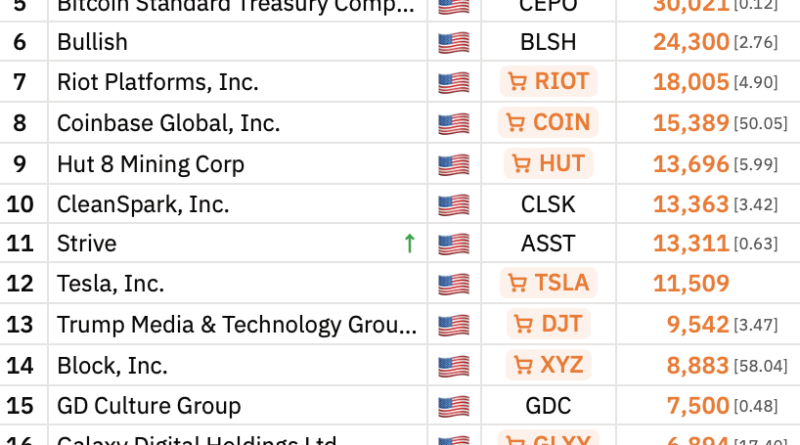 MicroStrategy, which rebranded to Strategy in February 2025, is currently the largest corporate Bitcoin holder, with 738,731 BTC on its balance sheet. Tesla ranks as the 12th-largest public holder, with 11,509 BTC.