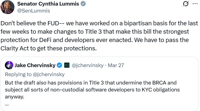 “Don’t believe the FUD,” Lummis said, adding, “We have worked on a bipartisan basis for the last few weeks to make changes to Title 3 that make this bill the strongest protection for DeFi and developers ever enacted. We have to pass the Clarity Act to get these protections.”