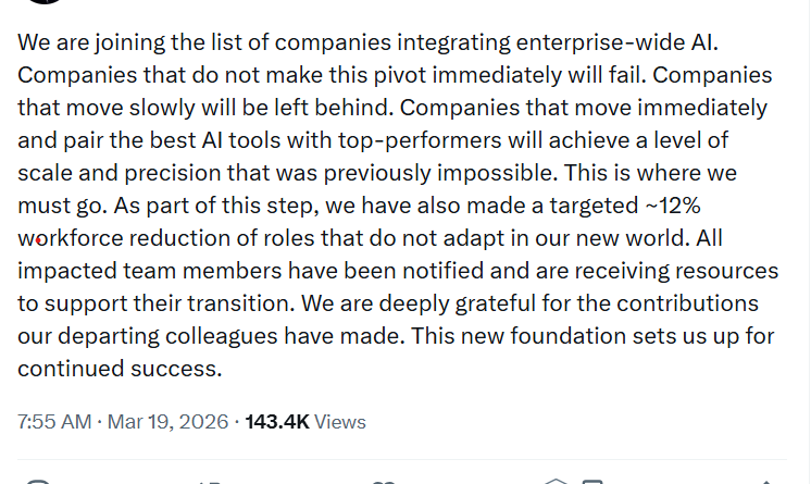 On March 19, crypto exchange Crypto.com announced a 12% workforce reduction due to AI integrations, warning that companies “that do not make this pivot immediately will fail.”