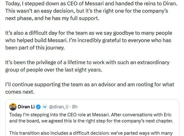 In a separate post, Diran Li announced that he was stepping into the CEO role at Messari.