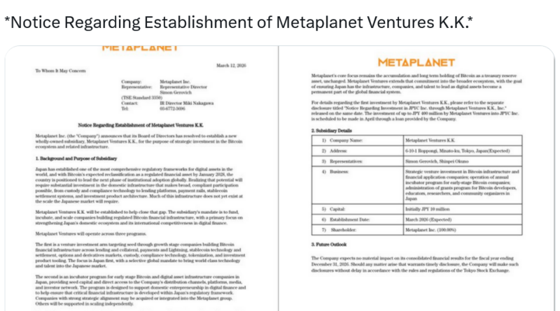 Metaplanet said on Thursday that Metaplanet Ventures K.K. will be tasked with funding, incubating and scaling companies that build regulated Bitcoin financial infrastructure, particularly those that strengthen Japan’s domestic ecosystem and make it a stronger competitor internationally.