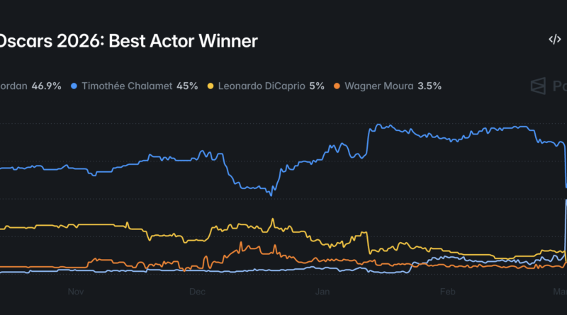 The Academy of Motion Picture Arts and Sciences awards show will air on March 15, and the prediction market for Oscars’ Best Actor has over $5.6 million in trading volume on Polymarket at the time of publication.
