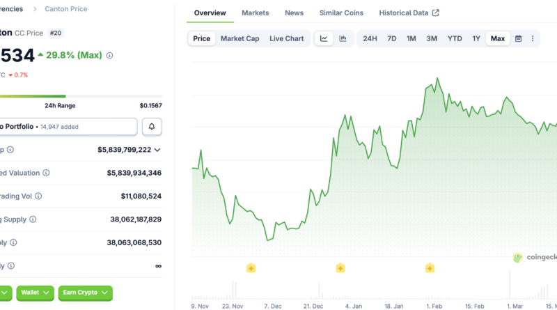 The value of Canton Coin, the network’s native token, has increased about 30% since its launch in November 2025, according to CoinGecko data.