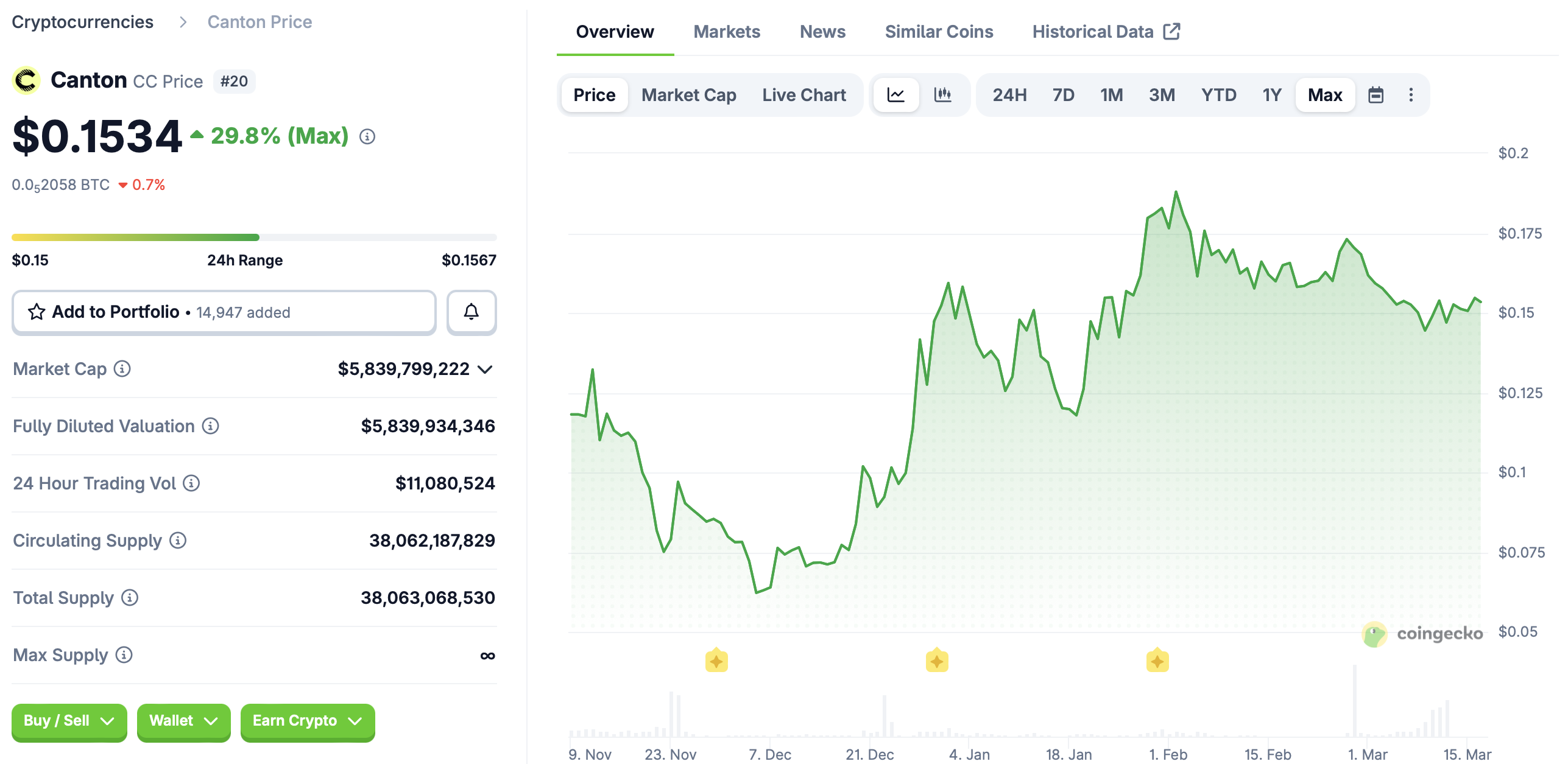The value of Canton Coin, the network’s native token, has increased about 30% since its launch in November 2025, according to CoinGecko data.