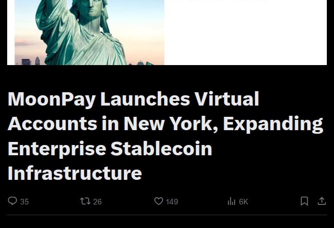 MoonPay has launched fiat-to-stablecoin virtual accounts in New York, allowing businesses to convert incoming funds from bank rails such as ACH and SWIFT into stablecoins and settle them directly to non-custodial wallets through a single API.