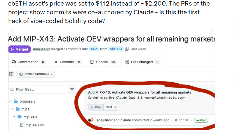 The pull requests for the affected contracts show multiple commits co-authored by Anthropic’s Claude Opus 4.6, prompting security auditor Pashov to publicly flag the incident as an example of artificial intelligence-written or AI-assisted Solidity backfiring.