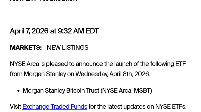 The launch of the Morgan Stanley Bitcoin Trust (MSBT) on April 8 was confirmed in a listing notice by the New York Stock Exchange on Tuesday.