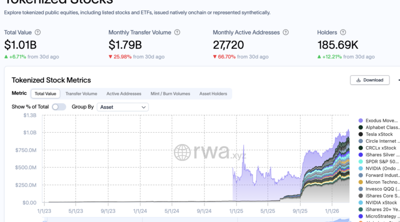 Tokenized public equities have grown to about $1.01 billion in total onchain value, according to data from RWA.xyz.