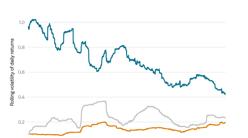 Data indicates that Bitcoin’s volatility has been on a gradual decline over time, though it still remains above that of assets like gold and certain stock indexes.