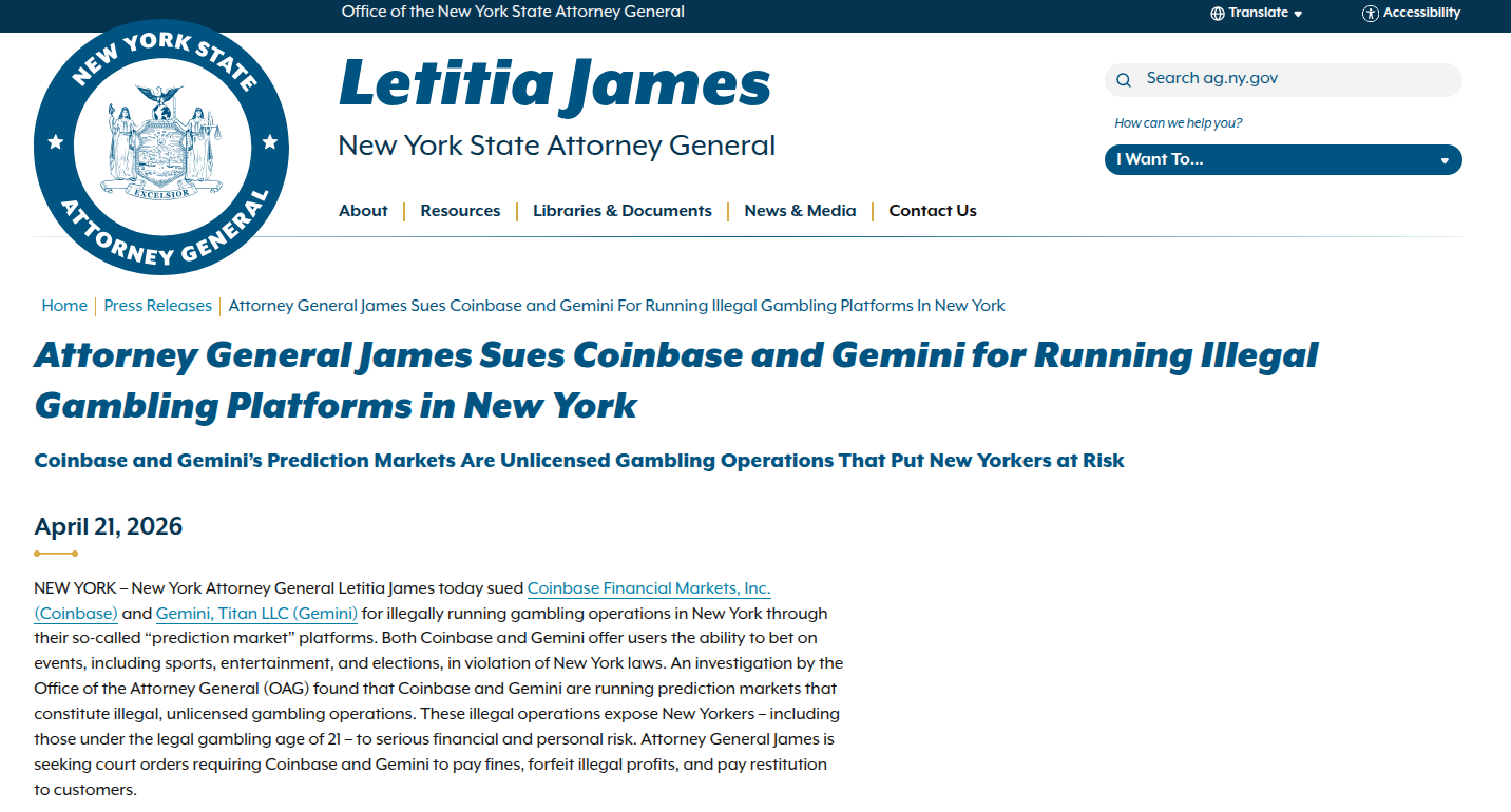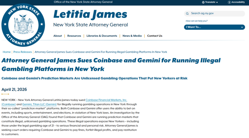 James said the lawsuit seeks to recover alleged illegal profits from operating prediction markets in the state, as well as restitution, and would bar Coinbase and Gemini from offering such products to individuals under 21 years of age.