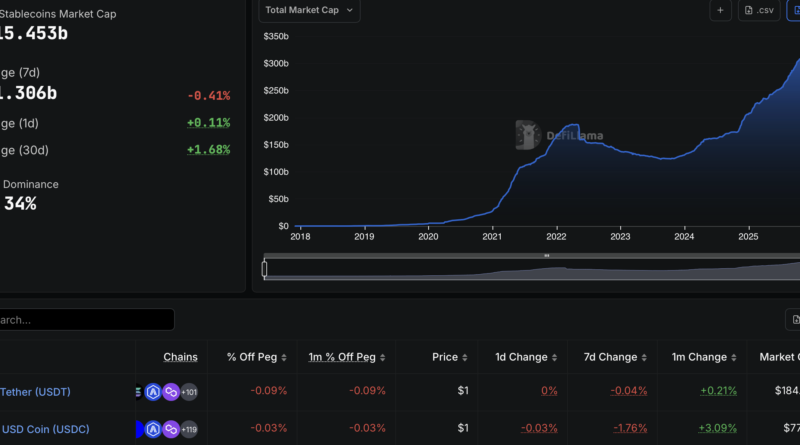At the time of writing, the stablecoin market capitalization exceeds $315 billion, according to DefiLlama data, with Tether’s USDT (USDT) accounting for about $184 billion, or around 58% of the market.
