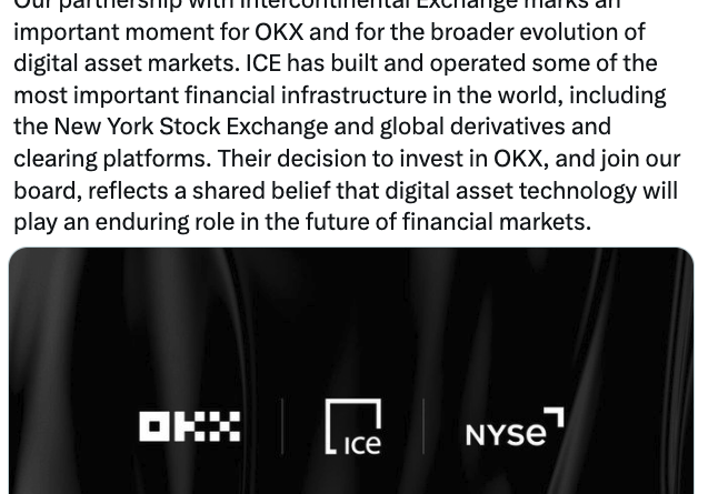 OKX will provide ICE with a live price feed of crypto assets listed on its platform. OKX will also provide access to ICE’s US futures and NYSE tokenized equities markets to its customer base of about 120 million accounts. The integration is expected to roll out in the second half of 2026.