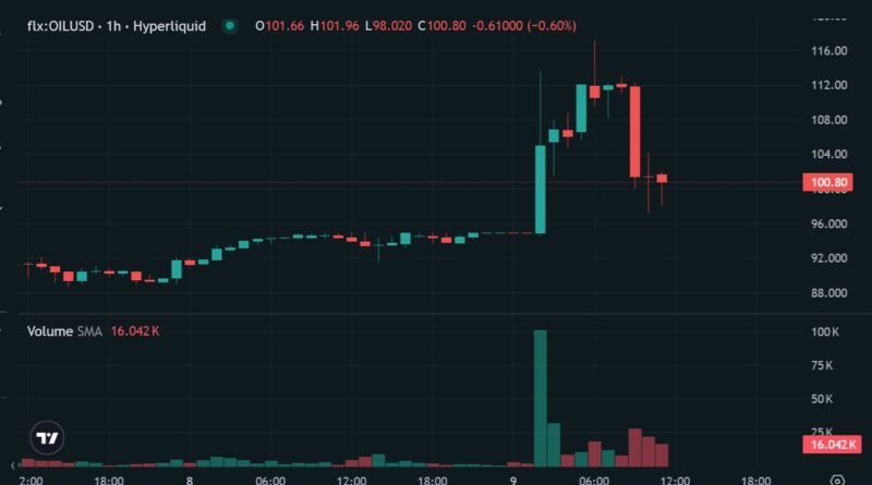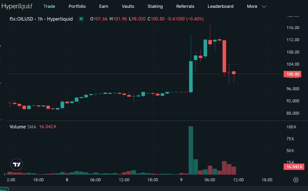 On Hyperliquid, crude oil futures rose nearly 25% to as high as about $117 overnight before falling by around 14.5% to roughly $100 after the G7 reports emerged. The reversal suggested traders were quickly repricing the risk of a coordinated reserve release even as the conflict continued to threaten supply.