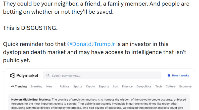 US Representative Seth Moulton condemned the market, calling it “disgusting” and expressing concerns over people speculating on the fate of a potentially injured service member. “They could be your neighbor, a friend, a family member. And people are betting on whether or not they’ll be saved,” Moulton wrote.