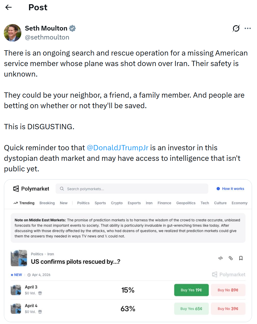 The controversy erupted after a prediction market appeared asking whether US authorities would confirm the rescue of a pilot reportedly shot down over Iran, with most users (over 60%) betting that they wouldn’t be rescued until Saturday.