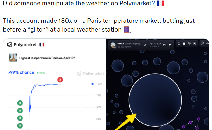 Meanwhile, blockchain analytics tool Bubblemaps reported a similar glitch for the April 15 market. The weather station showed 18 degrees Celsius most of the day, then suddenly spiked to 22 degrees Celsius before dropping back.