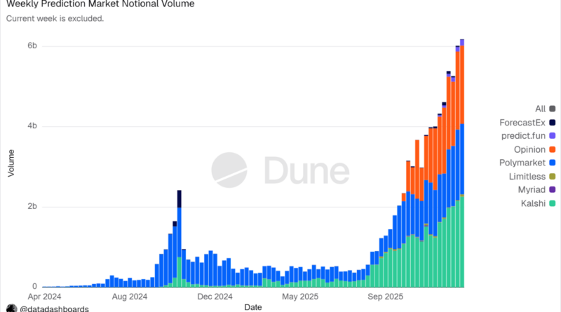 Monthly notional volume in prediction markets scaled to more than $13 billion by late 2025 from less than $100 million in early 2024 as markets diversified across verticals, according to a joint research report from Dune and Keyrock.