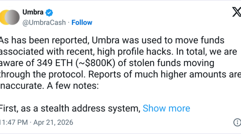 Umbra posted to X on Tuesday that it is aware that around $800,000 worth of stolen funds was moved via its protocol.