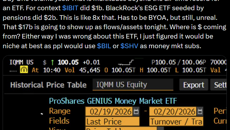 That backdrop makes the launch of the ProShares Genius Money Market ETF (IQMM) particularly notable. The actively managed fund, which primarily holds short-duration government securities, generated $17 billion in first-day trading volume on Thursday, an unprecedented figure for a newly launched ETF.