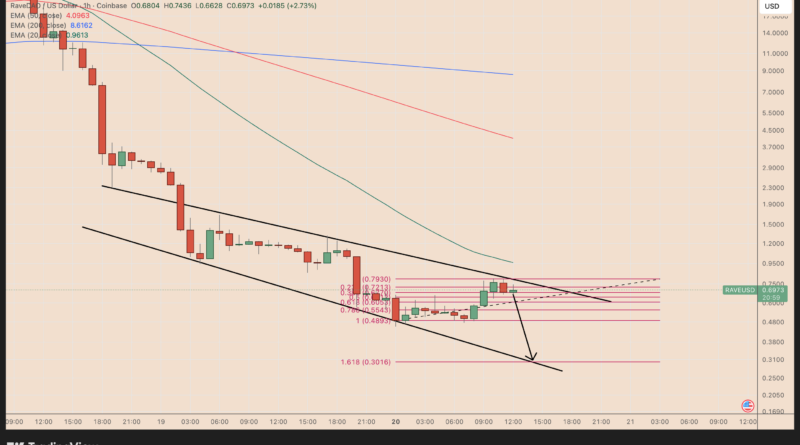 On the hourly chart, RAVE continues to trade inside a descending channel, with lower highs and lower lows forming between two downward-sloping trend lines.