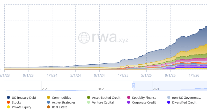 That figure broadly aligns with estimates of the current RWA market. Excluding stablecoins, tokenized real-world assets are valued at over $30 billion, led by products such as US Treasury exposure and private credit, according to RWA.xyz.