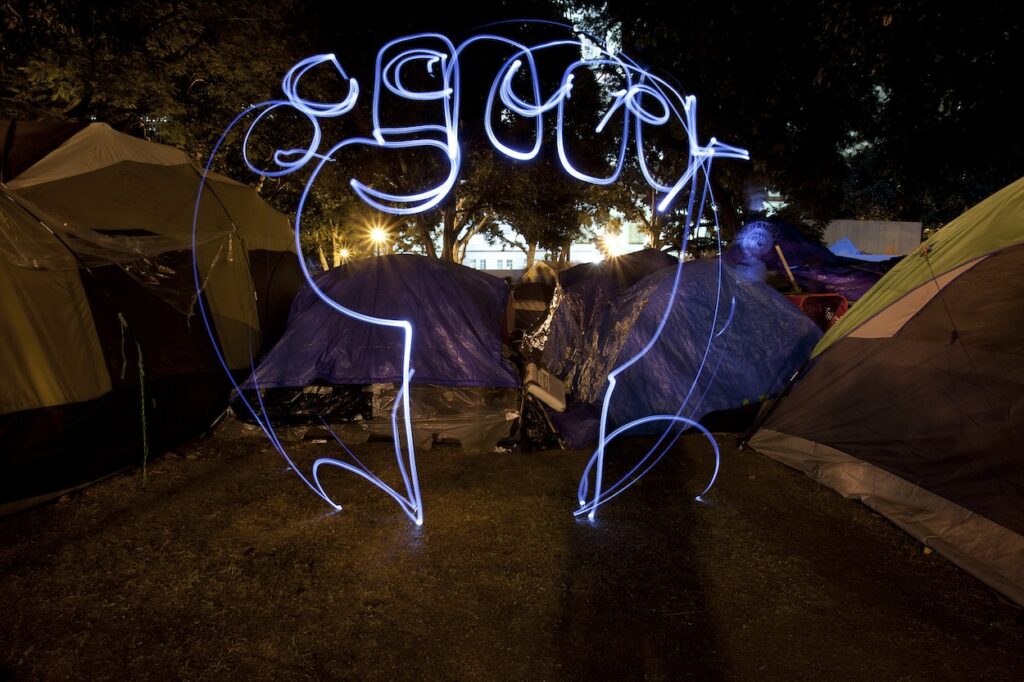BMAG: Street art is ephemeral by nature — it gets buffed, painted over, torn down, rained on. Some of your protest works from the Occupy era and earlier have survived. What does it mean to you that objects made in that spirit of urgency — work created to be temporary — are now being shown in a gallery context as historical artifacts?