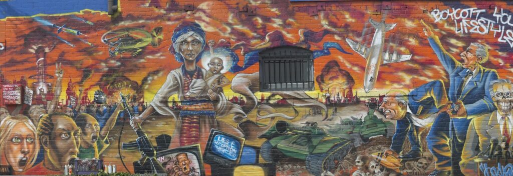BMAG: You were making anti-war street art during the first Gulf War. Now, more than thirty years later, we’re watching another military escalation in the Middle East — this time with Iran. The machinery looks different, the justifications sound different, but the economic architecture underneath it is remarkably similar. For a generation that came of age watching 9/11 become the justification for two decades of war and then watched the 2008 crash reveal that the financial system underwriting it all was itself a fraud — when you see this cycle repeating, does it feel like confirmation of something you’ve been saying on walls for decades, or does it feel like failure — that the message didn’t land?