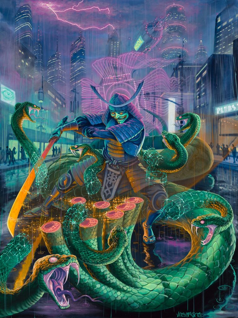 Mear One: I create an allegory that consists of the main factors, I am challenged to present it in its most digestible form; yet this is complicated subject matter so this challenge causes me to include subliminal psychedelic mythological archetypes and symbolism all coming together to assist in this complicated narrative, not only to create something visually compelling, but to give the subject matter a focus and a place to become a discussion amongst people. Through narrative art you can introduce ideas that people struggle with in the abstract.