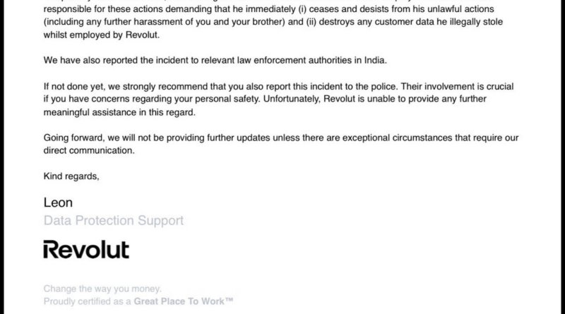 A Revolut spokesperson confirmed that the company has reported the matter to law enforcement and that authorities are investigating the alleged conduct of a former employee.