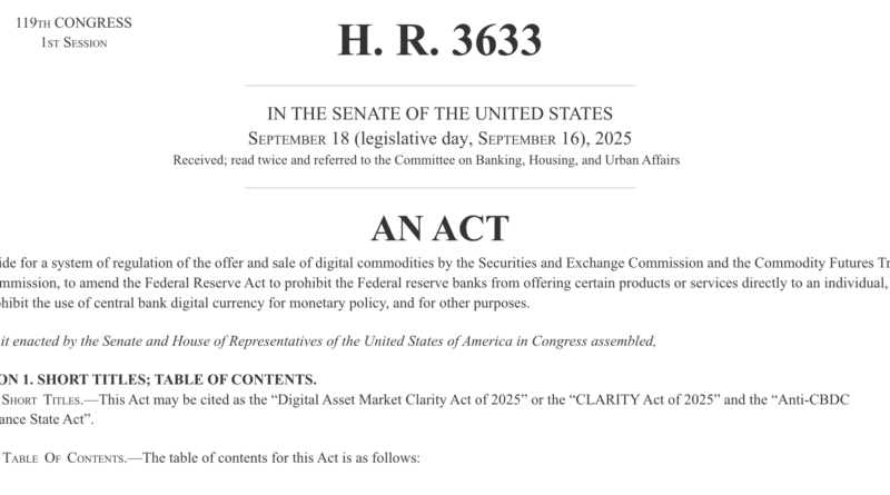 The Digital Asset Market Clarity Act of 2025, otherwise known as the CLARITY Act, is a major piece of crypto legislation and was widely anticipated to pass without issue after the GENIUS stablecoin framework was signed into law.