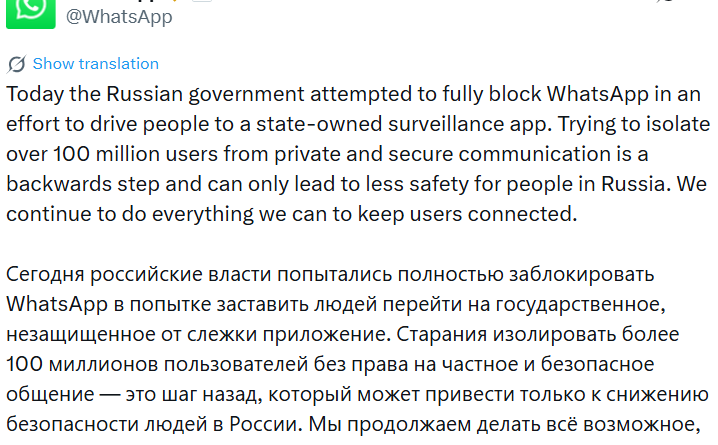 “Trying to isolate over 100 million users from private and secure communication is a backward step and can only lead to less safety for people in Russia. We continue to do everything we can to keep users connected,” the company said in an X post on Wednesday.