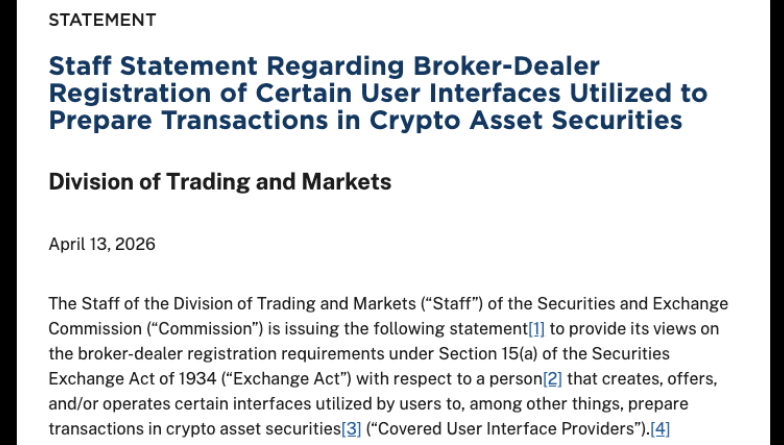 In a Monday statement, the SEC’s Division of Trading and Markets staff said that under certain circumstances, interfaces that “assist users engaging in user-initiated crypto asset securities transactions on blockchain protocols […] utilizing the user’s self-custodial wallet” may not necessarily be required to register as a broker-dealer with the agency.