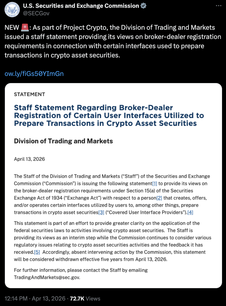 The US Securities and Exchange Commission (SEC) has issued a staff statement clarifying how the agency plans to interpret software interfaces facilitating crypto transactions in its broker-dealer regulations.