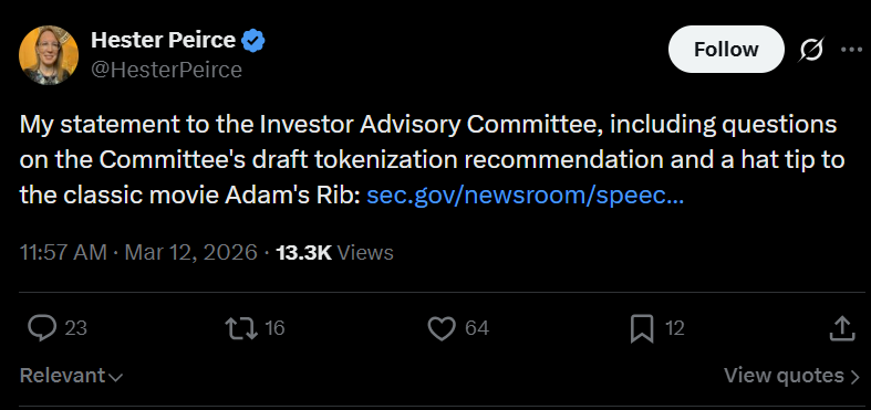 Although the speech addressed broader regulatory issues, Peirce also pointed to the growing debate around tokenized securities and blockchain-based financial infrastructure.