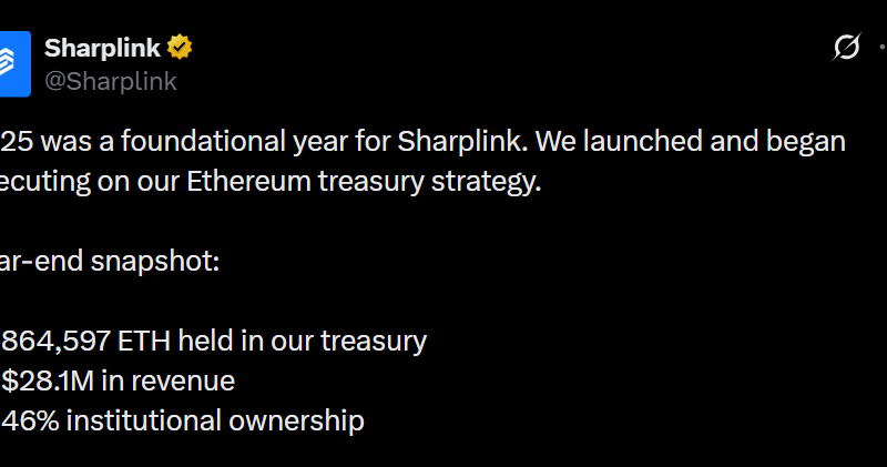 Sharplink is looking to gradually increase its Ether-per-share ratio to create long-term shareholder value. The firm said it managed to more than double this ratio in 2025, going from 2 ETH per share to 4.01 ETH per share.