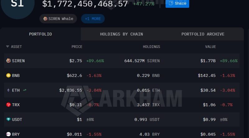 According to the Arkham Intelligence page, the entity holds 644 million SIREN (worth around $1.8 billion). The amount accounts for 88% of the entire circulating supply of 728 million tokens.
