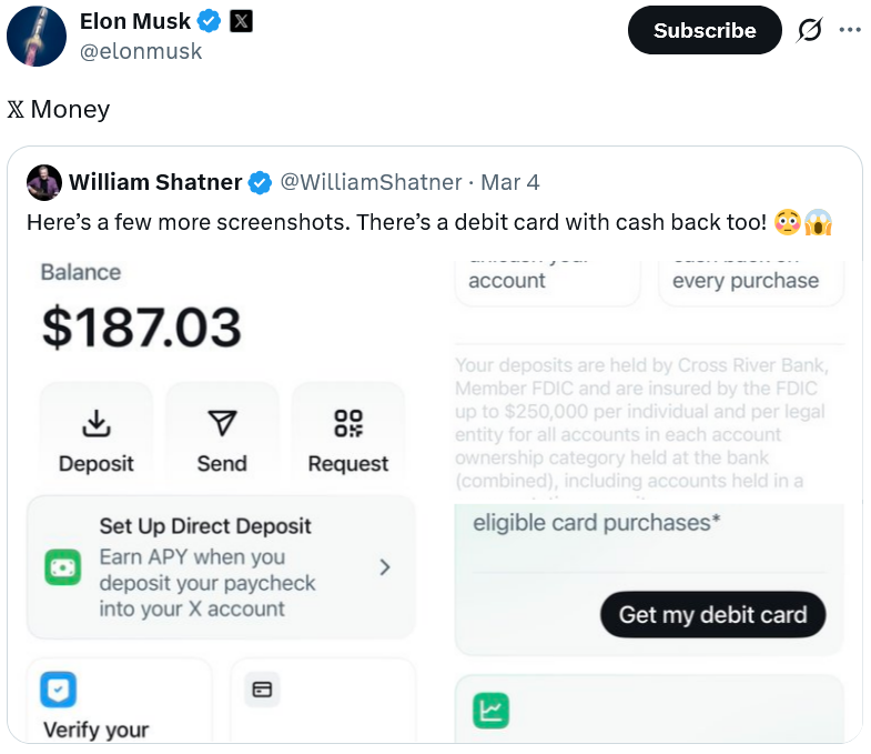 Those who register will be able to receive a metal X Money debit card with their username from X’s partner, Visa, Shatner noted.